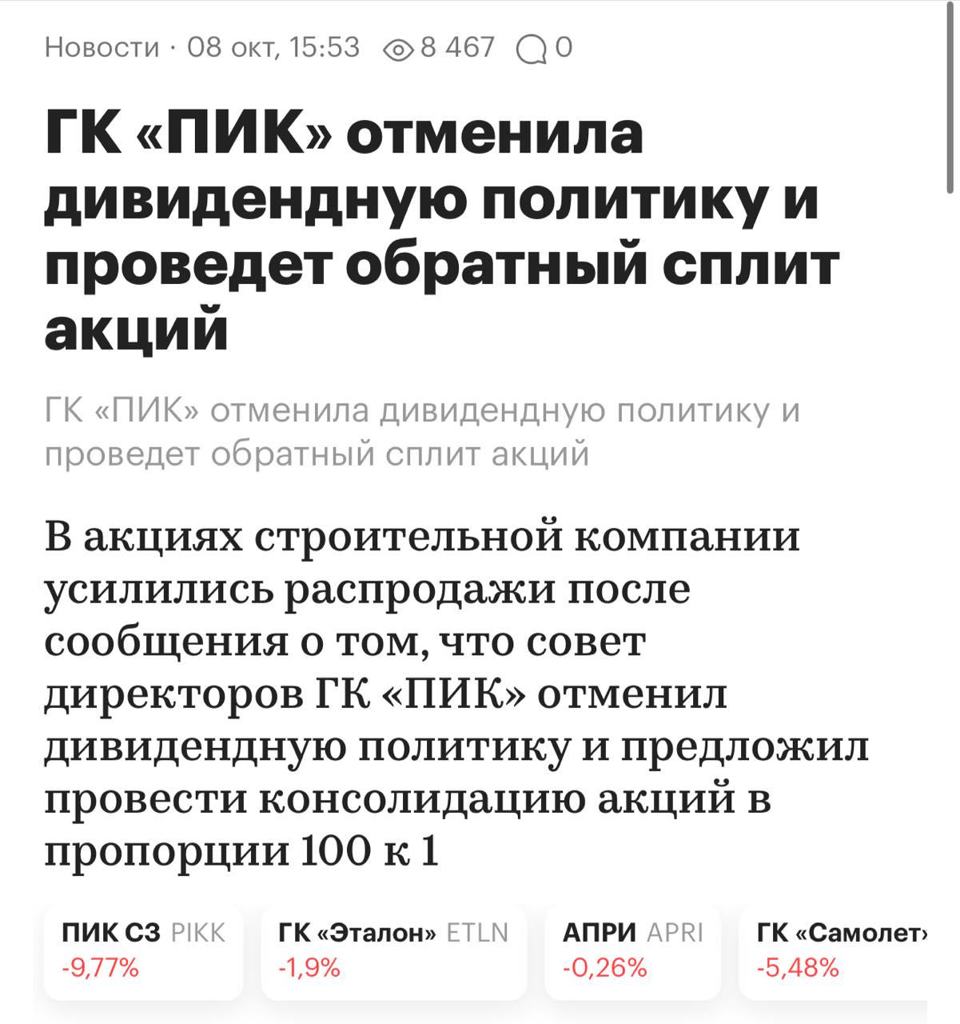 ‼️Новость: вчера СД ПИК рекомендовал акционерам провести обратный сплит акций (100 к 1, в результате чего бумага подорожает в 100 раз на торгах), а также отменил дивидендную политику. https://www.rbc.ru/quote/news/article/68e6258e9a7947f6fad7a02a?ysclid=mgjcy6jy93411208222