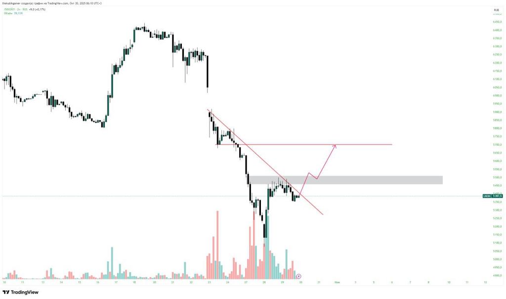 Обратите внимание на то, что цена актива сформировала максимум на отметках 5510 - пошла негативная реакция, если данная отметка пробьется на повышенном объеме, то актив станет интересен до отметок сопротивления на 5700, важно чтобы отметка ближайшего максимума пробилась на повышенном объеме - это повысит вероятность дальнейшего восходящего движения.