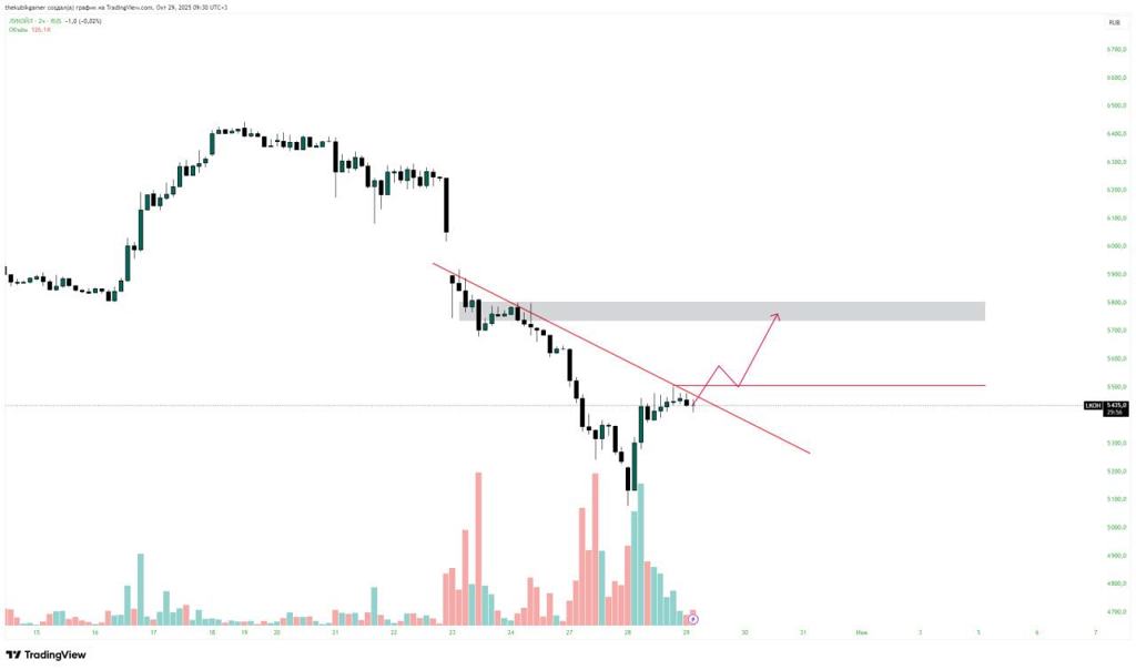 На график я нанес сценарий при котором актив может стать потенциально интересным, в случае если цена актива на повышенном объеме закрепится выше локального максимума на отметках 5500, то актив станет интересен до диапазона сопротивления 5760
