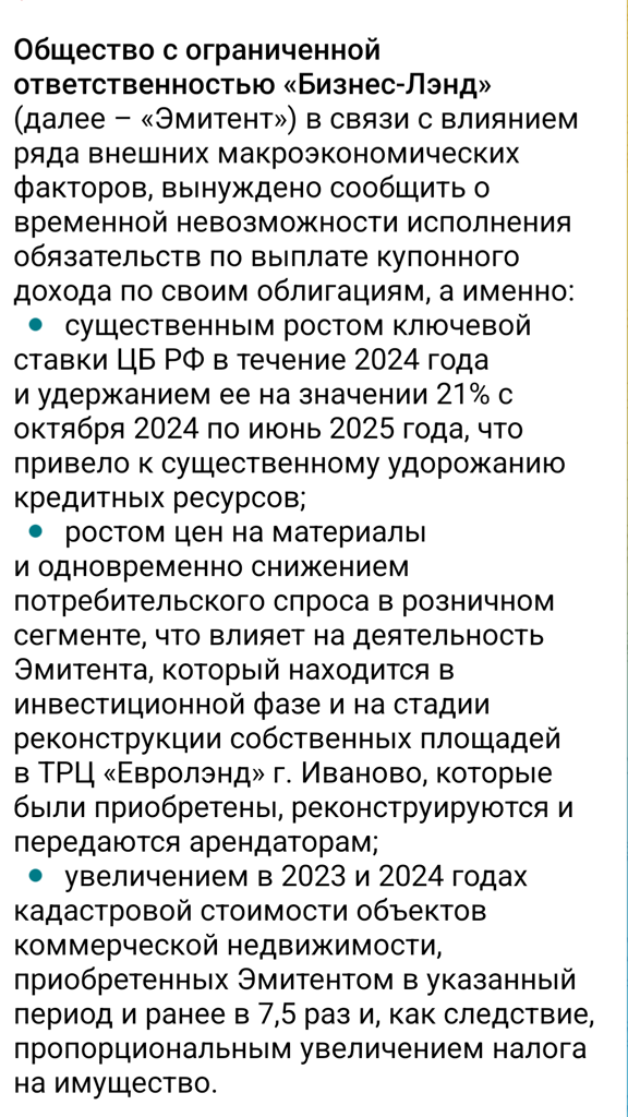 ⚠️ БИЗНЕС ЛЭНД $RU000A108WJ2 - блокировка счётов со стороны налоговой, около 50 миллионов рублей. Напомню, что первая подобная блокировка у компании случилась ещё перед размещением (и из нее выбрались), посему инвестиционно в моем поле зрения компания не присутствует.