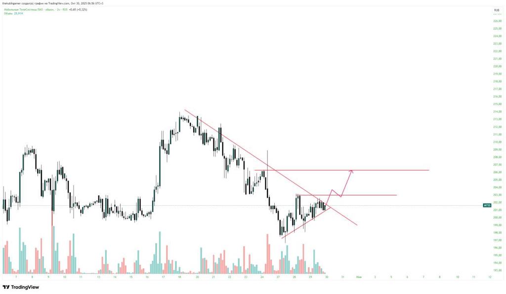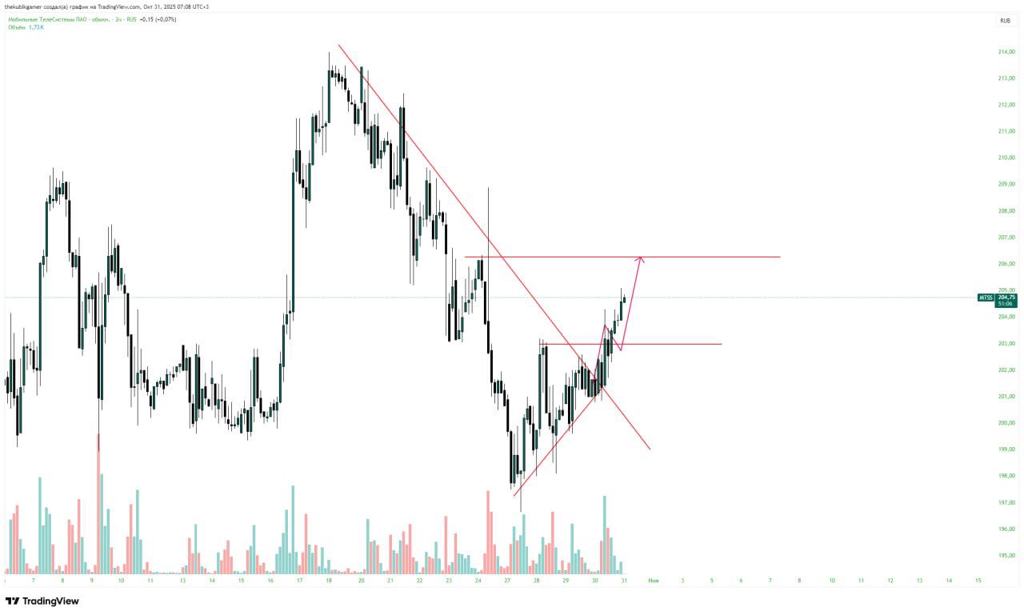 Мой прошлый прогноз пошел на отработку, цена актива сломила нисходящую структуру на повышенном объеме и получила импульс, локально ожидаю движение до 206 откуда скорее всего пойдет негативный импульс, так как ранее цена сформировала импульсное движение