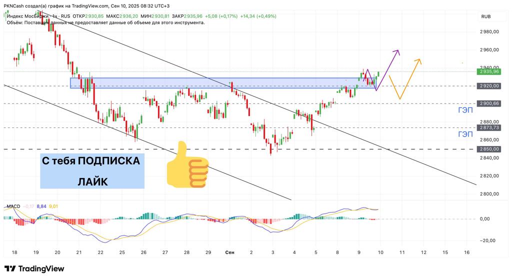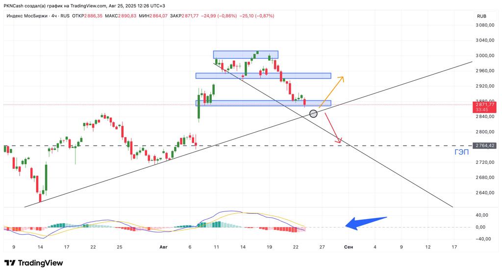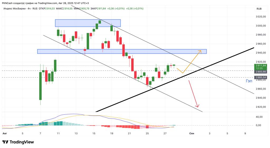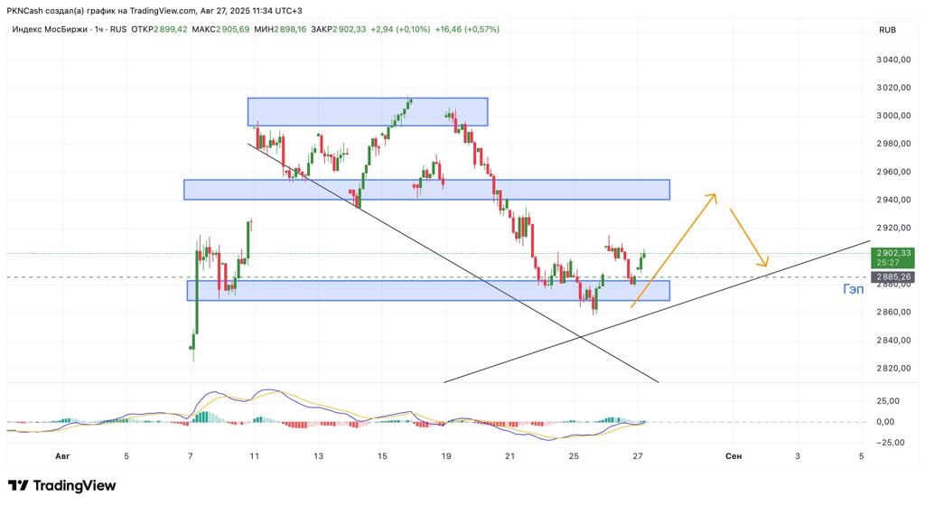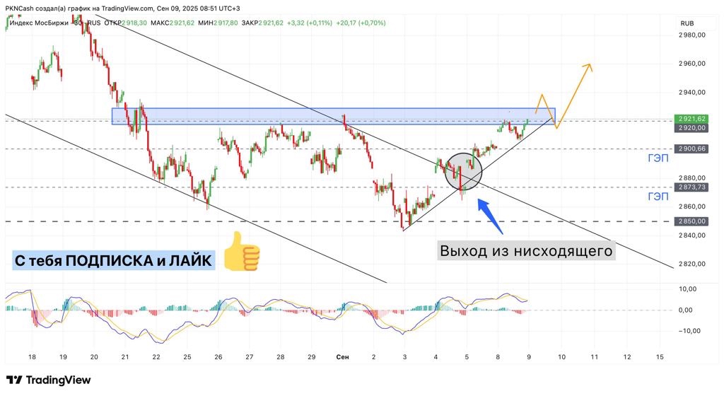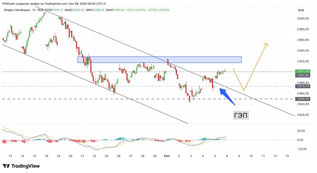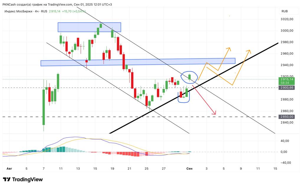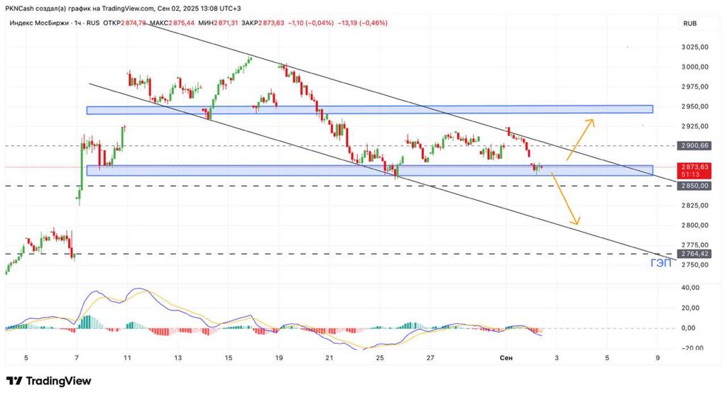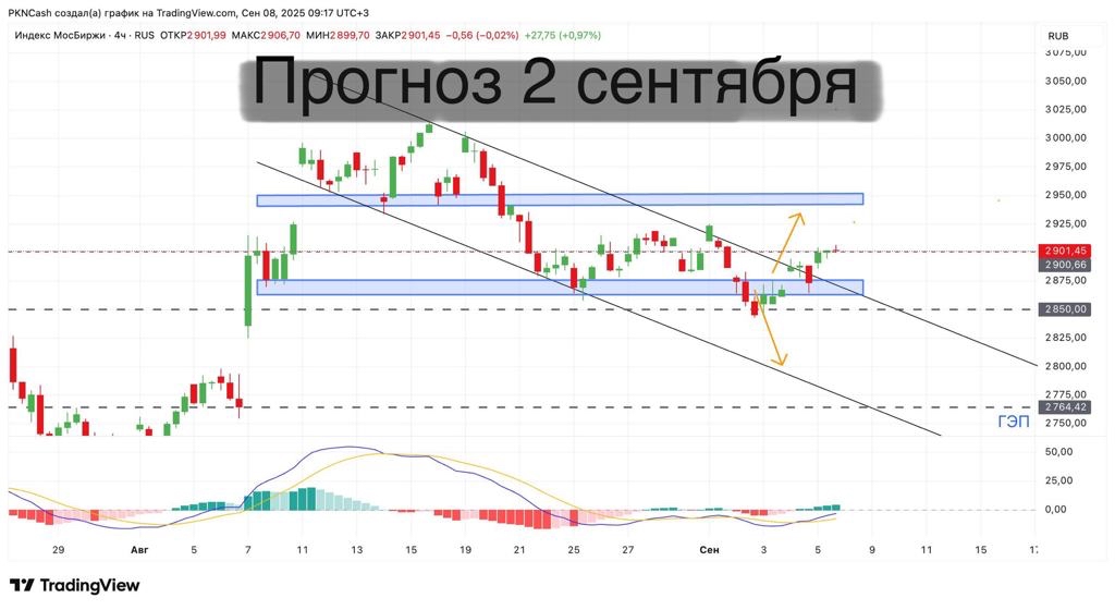 2 сентября давал прогноз с возможным падением и в район 2850, так и произошло, был тест уровня, сходили к 2840 и вернулись аж на 2900, а IMOEX2 вообще торгуется с утра на 2914