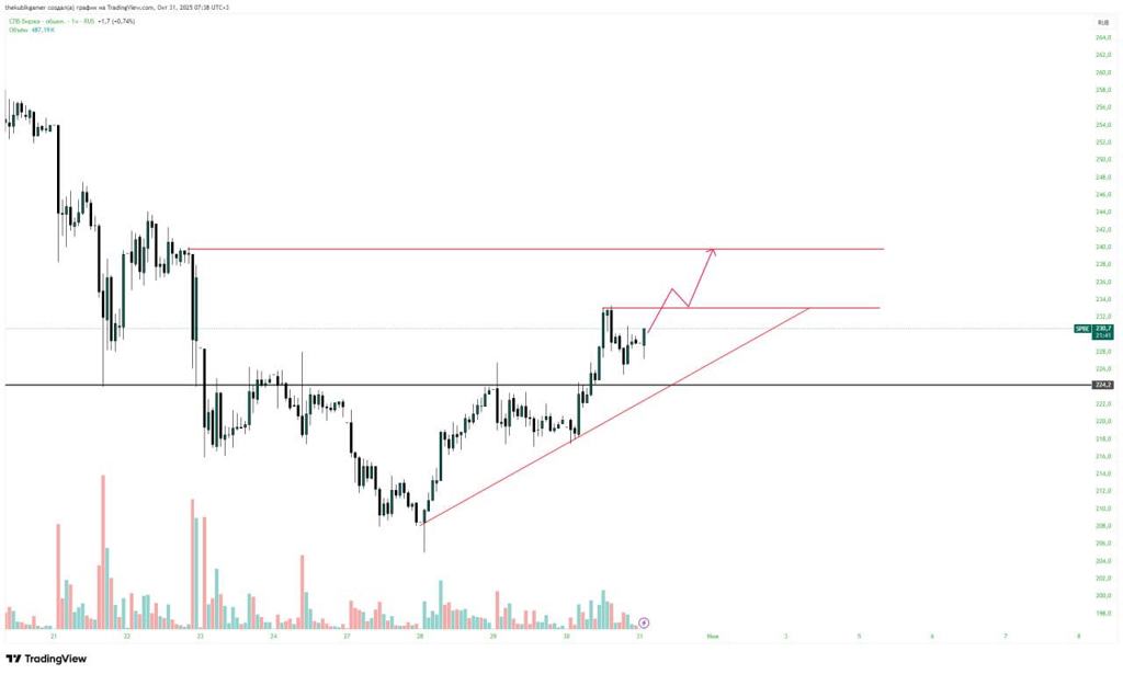 Обратите внимание на то, что цена актива начала формировать восходящую структуру - минимумы растут, в случае если цена актива обновит максимум выше, то актив станет интересен до отметок 239