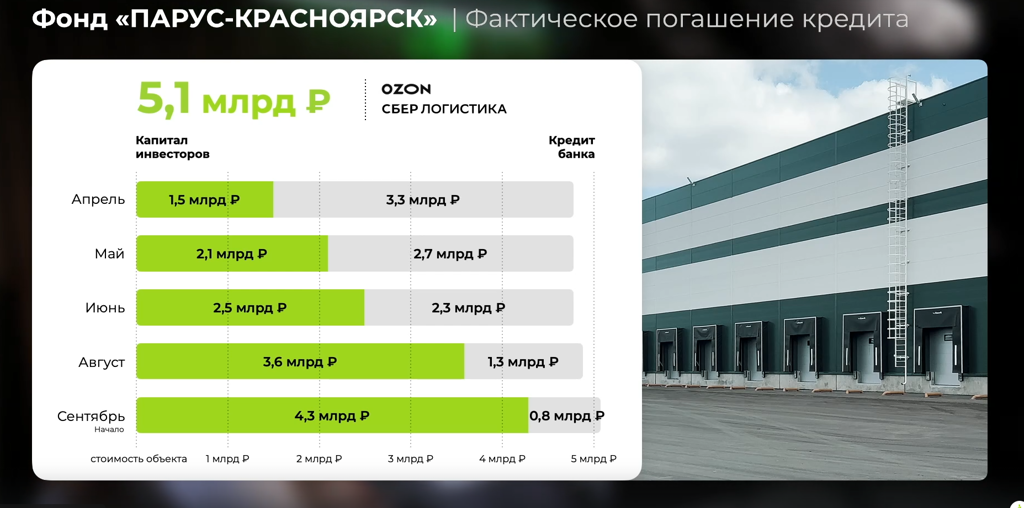 Комплекс на старте состоял из двух очередей общей площадью 65 000 кв. м. Якорные контракты заключены с лидерами рынка — Ozonи Сберлогистика. Стоимость квадратного метра при запуске фонда составляла 73 000 рублей, сейчас текущая рыночная стоимость логисти...