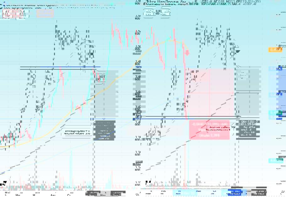 После уверенного пробоя уровня 0,47 (где был открыт шорт) цена достигла целевой зоны 0,4 ₽, и позиция была закрыта.