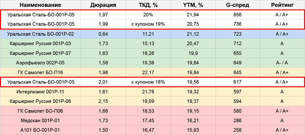 Выпуск напоминает бумаги Мечела/Кузницы $RU000A10C6M3 и Кокса – у Стали тоже всё сложно, все про это знают, поэтому приходится давать явную премию к рынку. При этом, в табличке видно, что на своей длине выпуск будет конкурировать в основном с плюс-минус такими же неоднозначными эмитентами, а всё хоть сколько-то благополучное торгуется существенно ниже