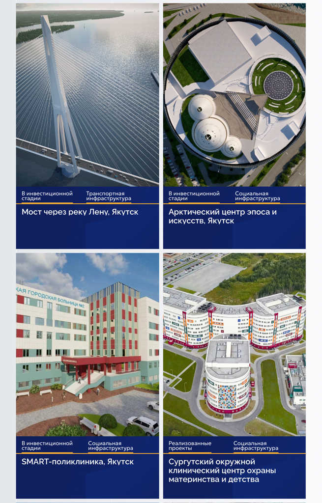 ВИС строит мегапроекты по всей России. Вот, например, мост через Лену стоимостью 130 млрд (который не могли построить 80 лет!) и мост через Калининградский залив; перинатальный центр в Сургуте, Мытищинская хорда в МО, обход Хабаровска, мост через Обь и сеть поликлин...
