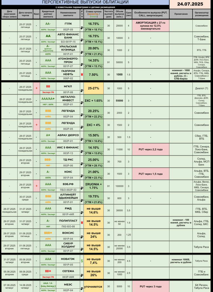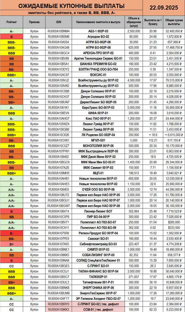 😊 Надеюсь, что в выходные удалось неплохо отдохнуть, ибо уже завтра нас ждут свежие выплаты от эмитентов. С-ПРИНТ $RU000A10BGE5 рискует получить второй технический дефолт, а вот присоединится ли к нему кто-то еще - узнаем в течение суток :)