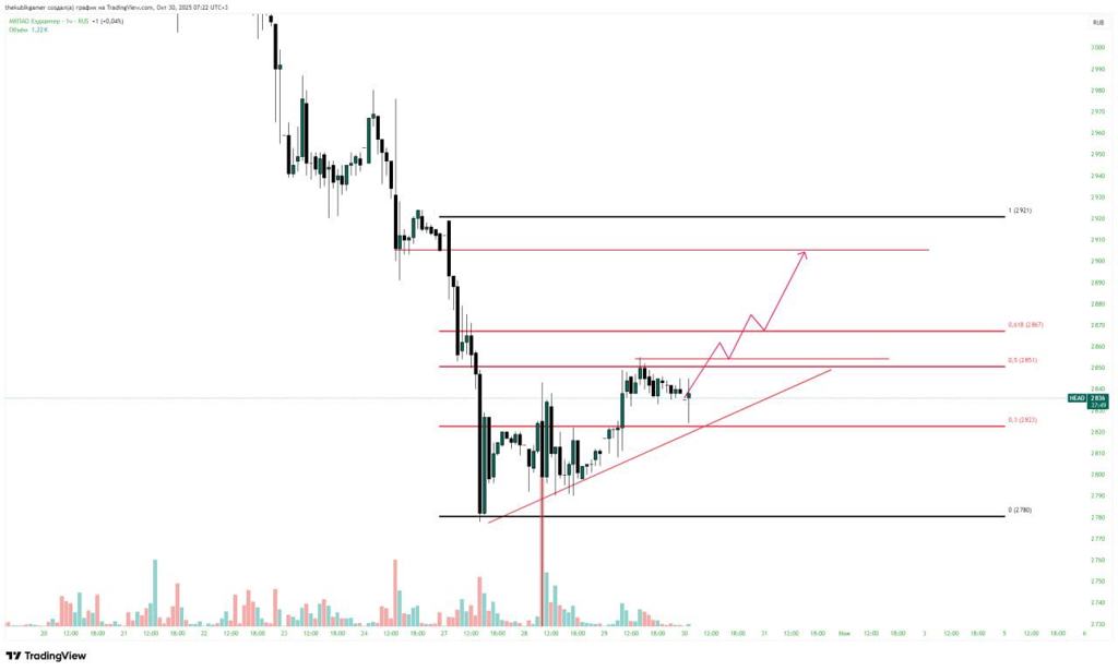 Цена актива начала формировать минимумы выше после длительного снижения, но пока реакции в виде объема нет, поэтому я бы дождался подтверждения пробоя отметки 0.5 по Фиббоначи отметки 2851, в случае если пойдет дальнейшая импульсная реакция, то актив станет интересен до отметок 2900 - диапазон от которого сформировалась импульсная негативная реакция