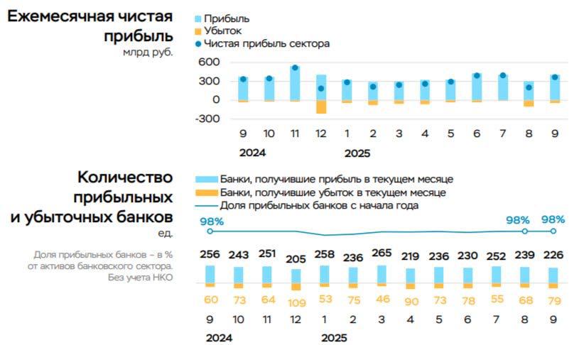 По данным ЦБ, в сентябре 2025 г. прибыль банков составила 367₽ млрд (+9,2% г/г, в августе — 203₽ млрд), по сравнению с прошлым годом устойчивое повышение — 336₽ млрд в сентябре 2024 г. Также отмечаю, что доходность на капитал в сентябре увеличилась с 13 до 23,1%. Теперь приступим к интересным фактам из отчёта: