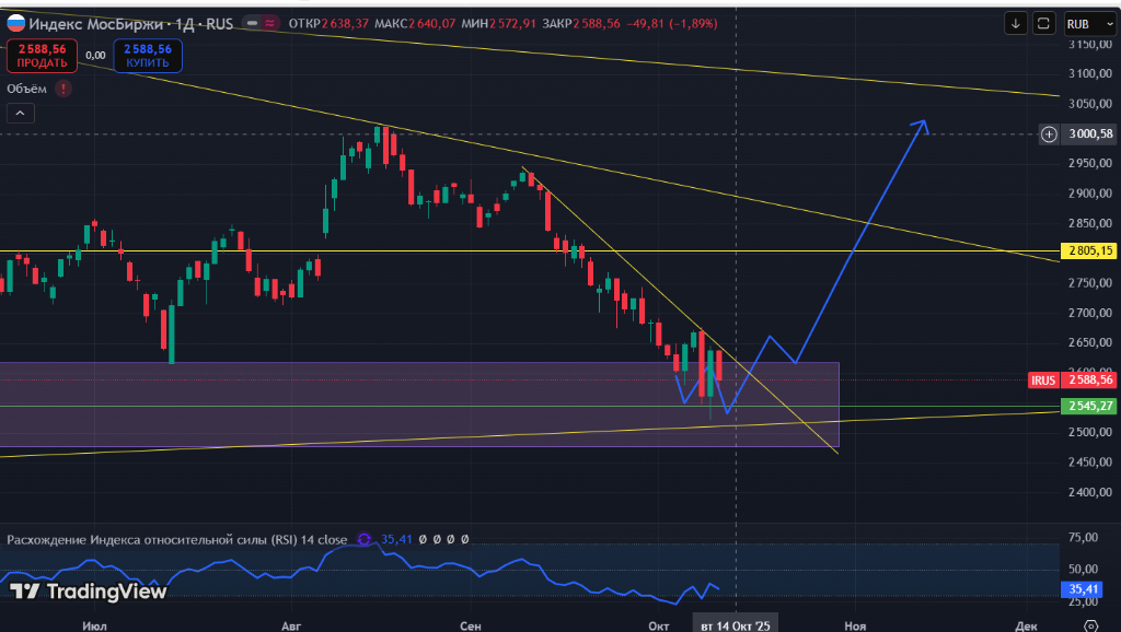 Посмотрим на индекс Мосбиржи: мы пришли к ключевому уровню в диапазоне 2500 - 2600. Отсюда, думаю, уйдем в небольшой боковик, а потом пойдем вверх. Я посмотрел новости и ничего серьезного не нашел. Мы падаем на ожиданиях и страхах (возм...